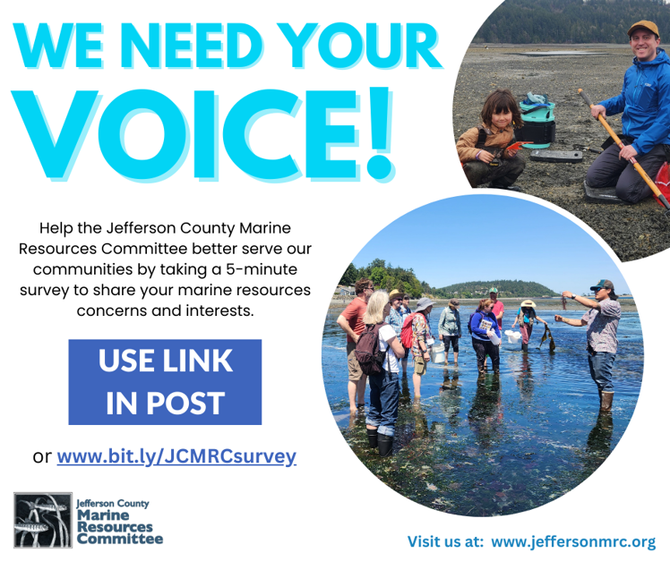 Please spare a few minutes to share your interests and concerns regarding East Jefferson County marine and nearshore resources. The Jefferson County Marine Resources Committee works with various partners on projects to better understand, restore, and protect our local marine and nearshore environments. Your valuable feedback will help to inform these efforts. Take the survey here. Thank you for taking the time to share your input!