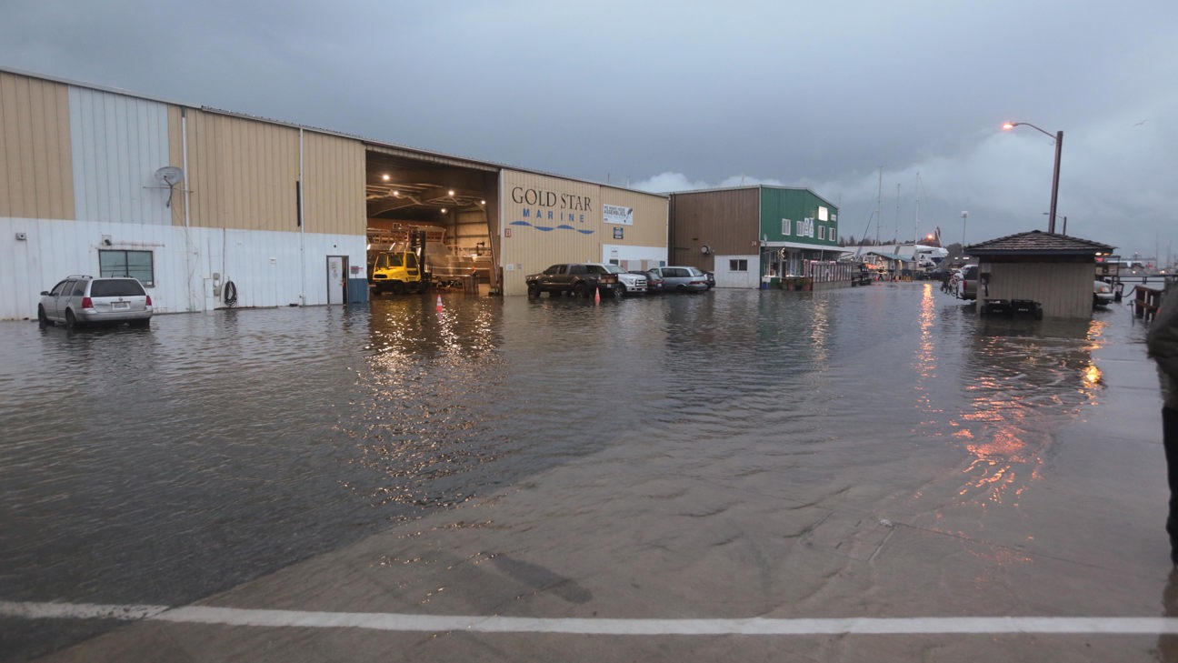 Port Townsend Boat Haven during the Dec 27, 2022 coastal flooding event caused by king tides (i.e., the highest tides of the year) coinciding with a strong, rainy winter storm, low barometric pressure, and prevailing onshore winds. Photo by Barney Burke.