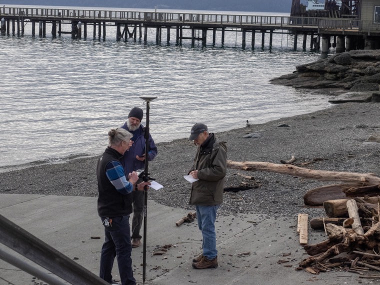 Ian Miller (WA Sea Grant), Jonathan Waggoner (Herrera Environmental), and Dave Wilkinson using high resolution GPS to map the boat ramp elevation. Photos by Jeff Taylor.