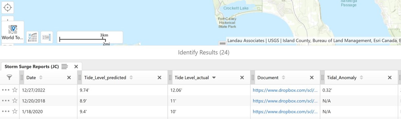 The highest water level we monitored at Port Townsend was 12 feet on December 27, 2022. Note the hyperlink in the document column will bring up the detailed report with information about the atmospheric conditions that caused the storm surge, photos, and measurements of the wave runup at the Port Townsend boat ramp.